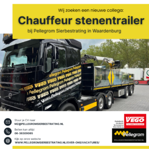 Een leuke en afwisselende baan met een stenentrailer. Standplaats bij Pellegrom Sierbestrating in Waardenburg. Veelal in de GWW, maar je zult ook bestellingen bij onze klanten afleveren voor de sierbestratingstak van ons bedrijf.